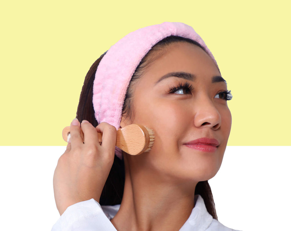 gently brush upward along your cheeks and forehead, outward around your eyes